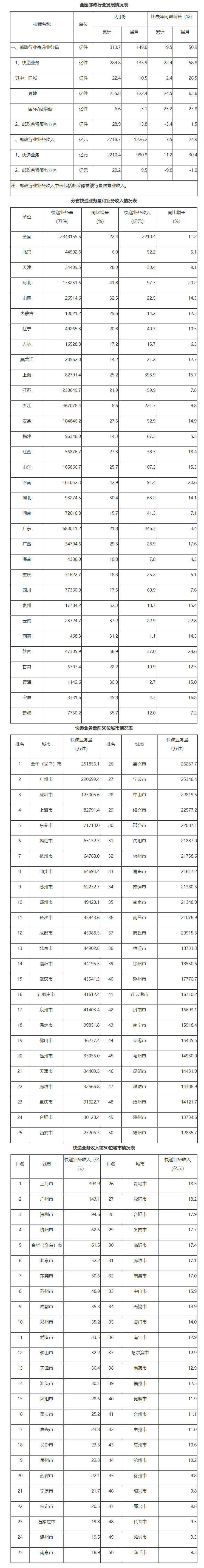 1.受去年春节假期导致基数较低因素影响,今年2月当月邮政行业主要指标同比增速较高。