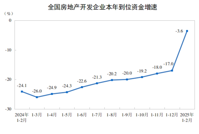 1—2月份,房地产开发企业到位资金15577亿元,同比下降3.6%。其中,国内贷款2954亿元,下降6.1%;利用外资1亿元,下降90.6%;自筹资金5233亿元,下降2.1%;定金及预收款4577亿元,下降0.9%;个人按揭贷款1945亿元,下降11.7%。