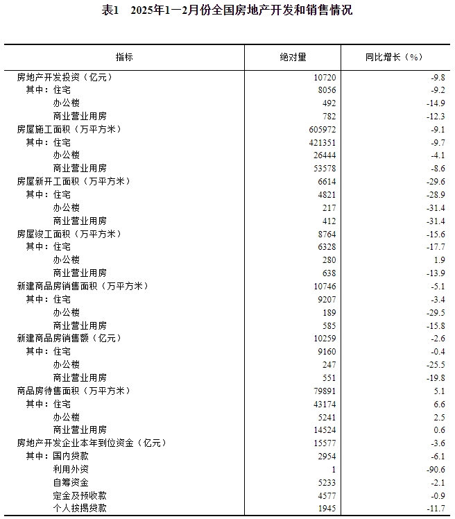 1—2月份,全国房地产开发投资10720亿元,同比下降9.8%(按可比口径计算,详见附注6),降幅比上年全年收窄0.8个百分点;其中住宅投资8056亿元,下降9.2%,降幅收窄1.3个百分点。