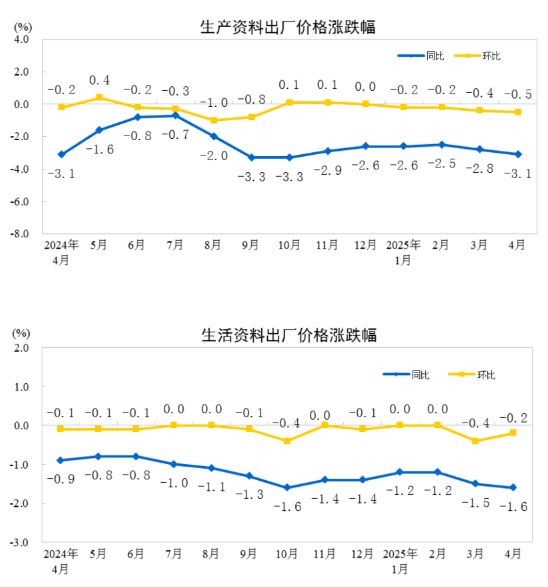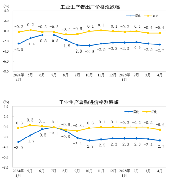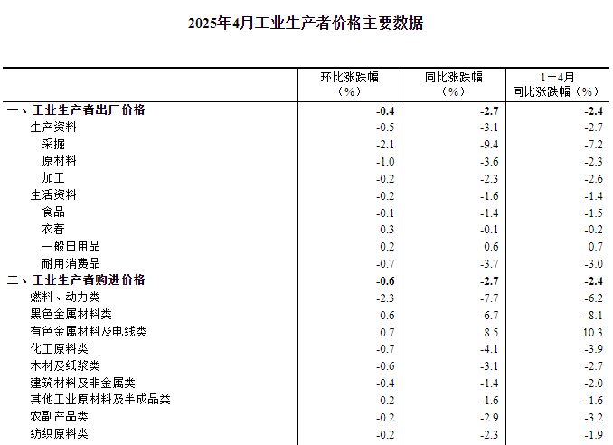 2025年4月份,全国工业生产者出厂价格同比下降2.7%,环比下降0.4%;工业生产者购进价格同比下降2.7%,环比下降0.6%。1—4月平均,工业生产者出厂价格和购进价格比上年同期均下降2.4%。