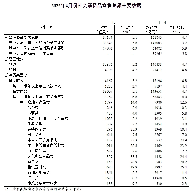 4月份,社会消费品零售总额37174亿元,同比增长5.1%。其中,除汽车以外的消费品零售额33548亿元,增长5.6%。1—4月份,社会消费品零售总额161845亿元,增长4.7%。其中,除汽车以外的消费品零售额147005亿元,增长5.2%。