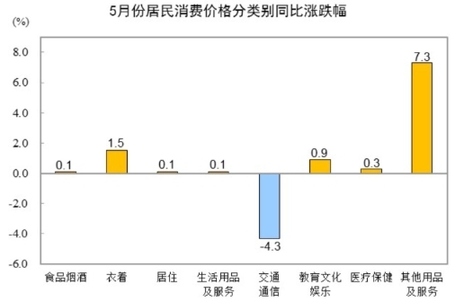 其他七大类价格同比六涨一降。其中,其他用品及服务、衣着、教育文化娱乐价格分别上涨7.3%、1.5%和0.9%,医疗保健、居住、生活用品及服务价格分别上涨0.3%、0.1%和0.1%;交通通信价格下降4.3%。