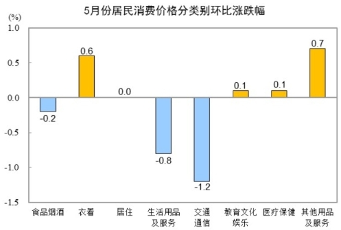 5月份,全国居民消费价格环比下降0.2%。其中,城市下降0.2%,农村下降0.2%;食品价格下降0.2%,非食品价格下降0.2%;消费品价格下降0.3%,服务价格持平。
