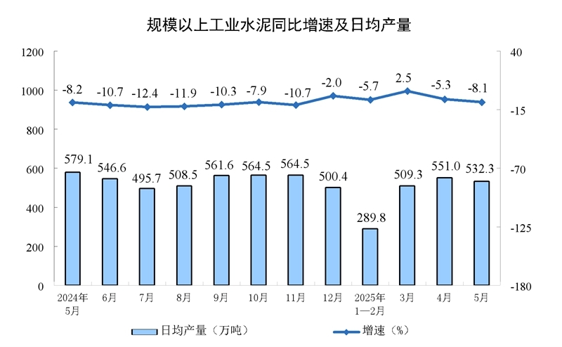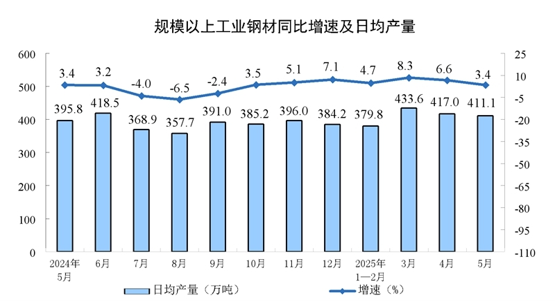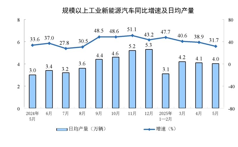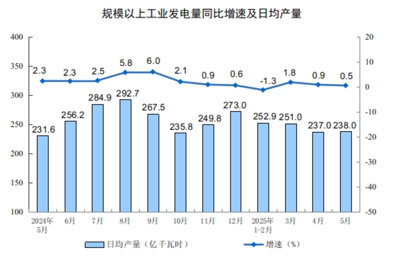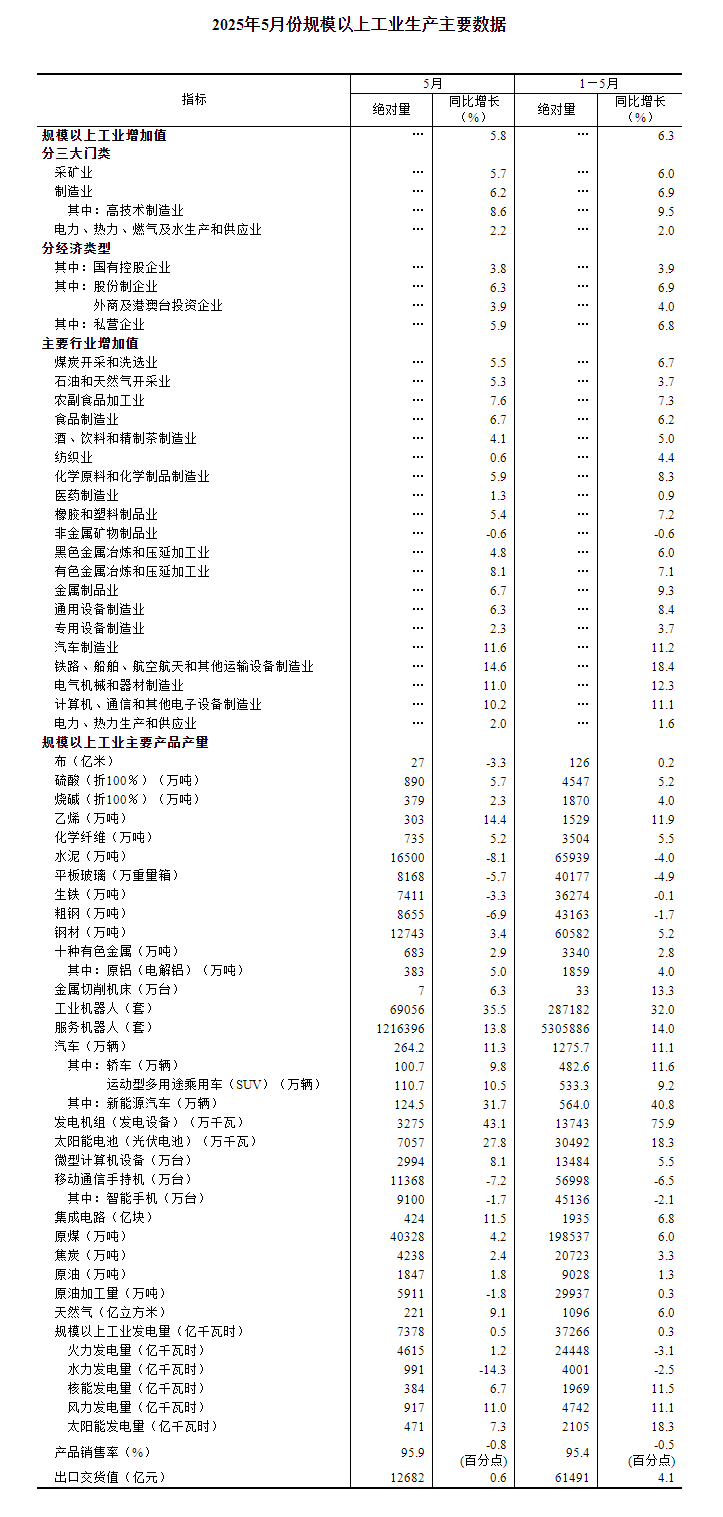 分产品看,5月份,规模以上工业623种产品中有326种产品产量同比增长。其中,钢材12743万吨,同比增长3.4%;水泥16500万吨,下降8.1%;十种有色金属683万吨,增长2.9%;乙烯303万吨,增长14.4%;汽车264.2万辆,增长11.3%,其中新能源汽车124.5万辆,增长31.7%;发电量7378亿千瓦时,增长0.5%;原油加工量5911万吨,下降1.8%。