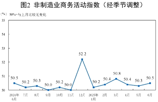 6月份,非制造业商务活动指数为50.5%,比上月上升0.2个百分点,非制造业总体继续保持扩张。