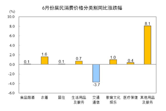 其他七大类价格同比六涨一降。其中,其他用品及服务、衣着、教育文化娱乐价格分别上涨8.1%、1.6%和1.0%,生活用品及服务、医疗保健、居住价格分别上涨0.7%、0.4%和0.1%;交通通信价格下降3.7%。