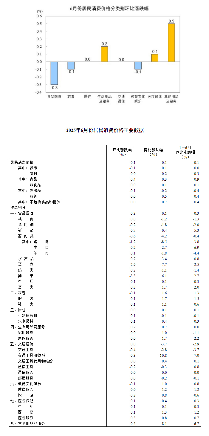 2025年6月份,全国居民消费价格同比上涨0.1%。其中,城市上涨0.1%,农村下降0.2%;食品价格下降0.3%,非食品价格上涨0.1%;消费品价格下降0.2%,服务价格上涨0.5%。上半年,全国居民消费价格比上年同期下降0.1%。