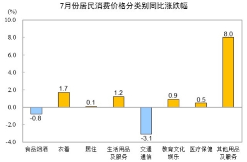 其他七大类价格同比六涨一降。其中,其他用品及服务、衣着、生活用品及服务价格分别上涨8.0%、1.7%和1.2%,教育文化娱乐、医疗保健、居住价格分别上涨0.9%、0.5%和0.1%;交通通信价格下降3.1%。