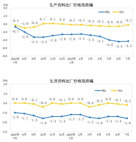2025年7月份,全国工业生产者出厂价格环比下降0.2%,工业生产者购进价格环比下降0.3%,降幅比上月分别收窄0.2个和0.4个百分点。工业生产者出厂价格同比下降3.6%,工业生产者购进价格同比下降4.5%。1—7月平均,工业生产者出厂价格比上年同期下降2.9%,工业生产者购进价格下降3.2%。