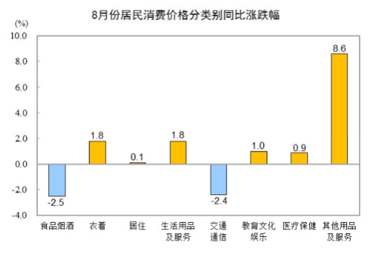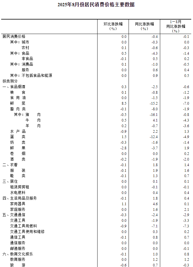 2025年8月份居民消费价格同比下降0.4% 环比持平