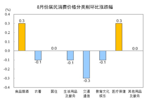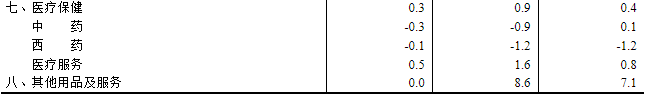 其他七大类价格环比一涨两平四降。其中,医疗保健价格上涨0.3%;居住、其他用品及服务价格均持平;交通通信价格下降0.3%,衣着、生活用品及服务、教育文化娱乐价格均下降0.1%。