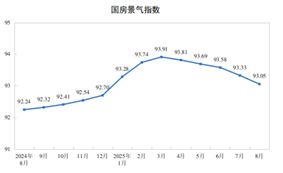 8月份,房地产开发景气指数(简称“国房景气指数”)为93.05。