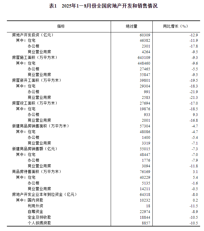 1—8月份,全国房地产开发投资60309亿元,同比下降12.9%(按可比口径计算,详见附注6);其中,住宅投资46382亿元,下降11.9%。
