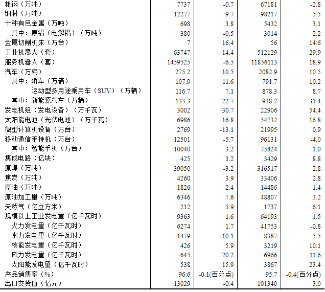 分产品看,8月份,规模以上工业623种产品中有319种产品产量同比增长。其中,钢材12277万吨,同比增长9.7%;水泥14802万吨,下降6.2%;十种有色金属698万吨,增长3.8%;乙烯314万吨,增长10.4%;汽车275.2万辆,增长10.5%,其中新能源汽车133.3万辆,增长22.7%;发电量9363亿千瓦时,增长1.6%;原油加工量6346万吨,增长7.6%。