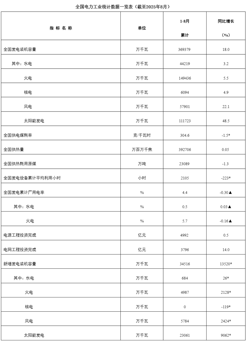 国家江南官网app 发布2025年1—8月份全国电力工业统计数据 风光装机约17亿千瓦