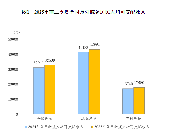 前三季度,全国居民人均可支配收入32509元,比上年同期名义增长5.1%,扣除价格因素,实际增长5.2%。分城乡看,城镇居民人均可支配收入42991元,增长(以下如无特别说明,均为同比名义增长)4.4%,扣除价格因素,实际增长4.5%;农村居民人均可支配收入17686元,增长5.7%,扣除价格因素,实际增长6.0%。