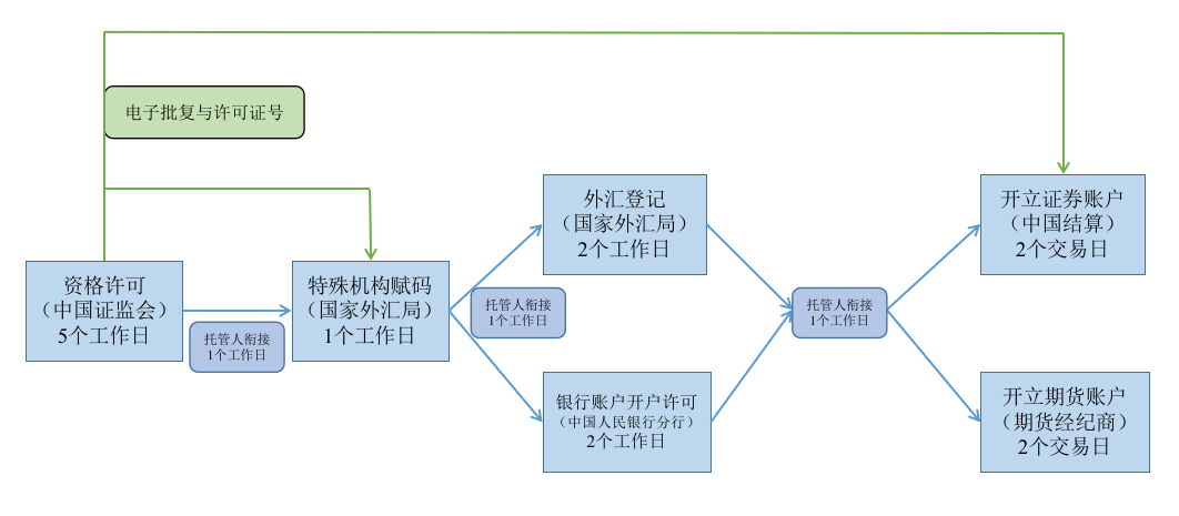 合格境外投资者资格许可法定时限为10个工作日,承诺办理时限5个工作日;特殊机构赋码办理时限1个工作日;外汇登记办理时限2个工作日;银行账户开户许可办理时限2个工作日;证券期货账户开立时限2个交易日。托管人衔接办理时限如五(二)所列。办理时限自托管人完成尽职调查等工作后、各单位收到完整材料起算。办理流程示意图见附件2。