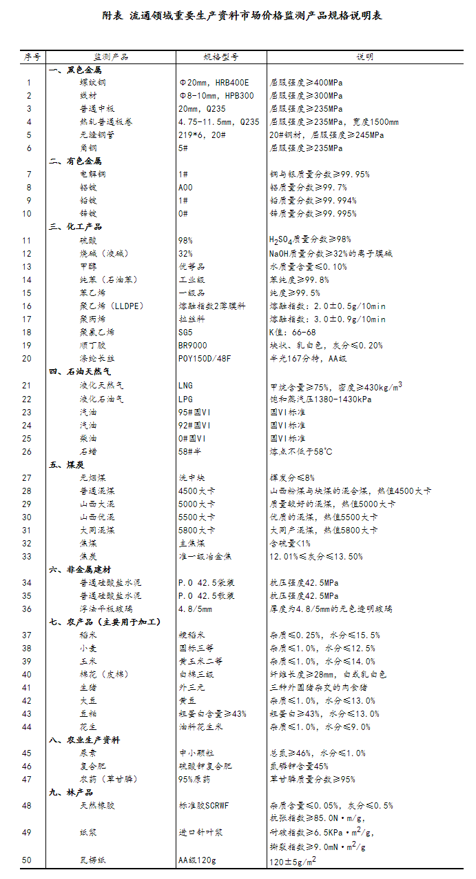 流通领域重要生产资料市场价格监测内容包括9大类50种产品的价格。类别与产品规格说明详见附表。