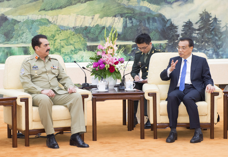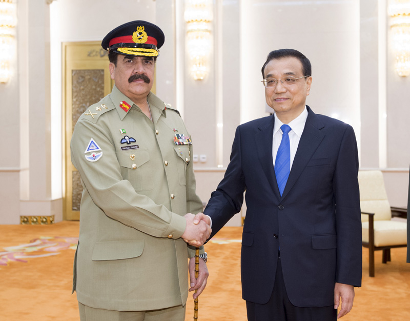 李克强指出,中巴经济走廊不仅是两国务实合作的旗舰项目,也有利于地区的发展与繁荣。中方赞赏巴政府和军方对走廊建设顺利推进的大力支持。相信双方共同努力,一定能充分发挥两国传统友好、地缘毗邻、经济互补的优势,共享机遇,共迎挑战,共谋发展,更好造福两国人民。