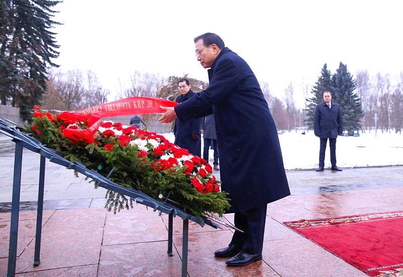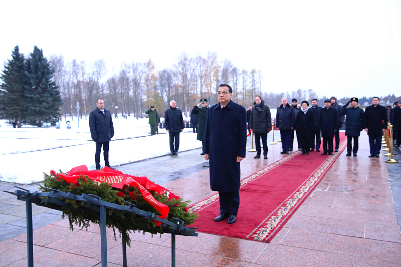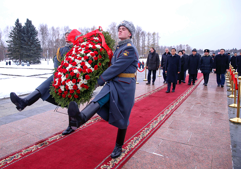 李克强向圣彼得堡皮斯卡廖夫公墓纪念碑献花圈