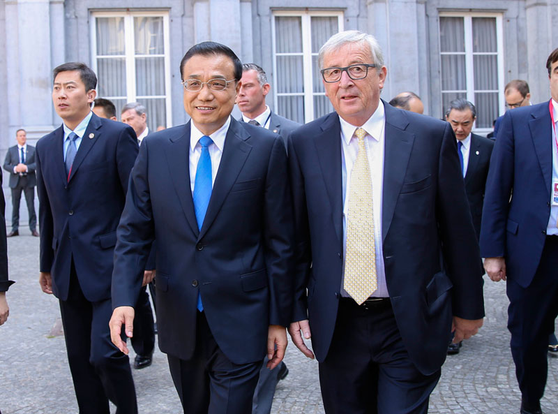 当地时间2日上午,李克强总理在布鲁塞尔出席第十二届中欧工商峰会并发表演讲后,在欧盟委员会主席容克陪同下,与参加第三次中欧创新合作对话的主要代表合影。