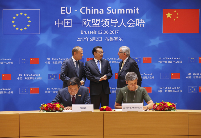 当地时间2日中午,在布鲁塞尔举行的第十九次中欧领导人会晤后,李克强总理同欧洲理事会主席图斯克、欧盟委员会主席容克共同见证了有关海关、知识产权、创新发展、旅游、投资、能源等领域十余项中欧合作文件的签署。