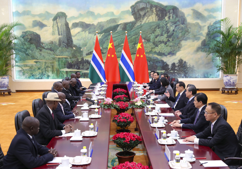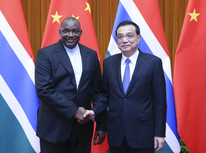 李克强表示,中国和冈比亚复交顺应时代潮流,翻开了两国关系发展新的一页。昨天习近平主席同总统先生举行了富有成果的会谈,为两国关系发展注入了新动力。希望冈方坚定奉行一个中国政策。中方愿同冈方秉持相互尊重、平等相待的原则,推动两国关系向前发展。