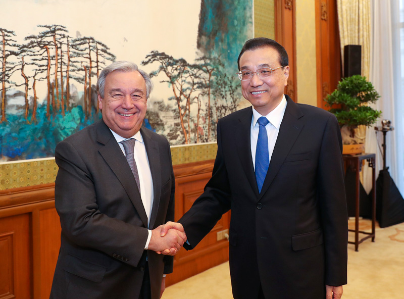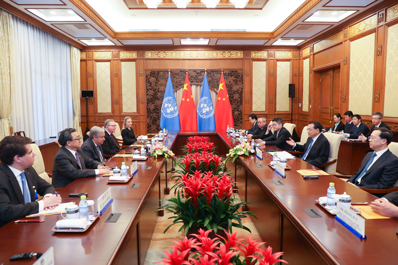 李克强积极评价中国同联合国的关系与合作,强调中国坚定维护以联合国宪章为基础的国际关系基本准则,支持联合国在国际事务中发挥核心作用,将继续建设性参与联合国各领域工作,积极推动落实联合国2030年可持续发展议程,为促进世界和平与发展作出不懈努力。