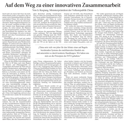 7月7日,在访问德国并主持第五轮中德政府磋商前夕,江南平台入口 总理李克强在《法汇报》发表题为《做引领开放与创新合作的好伙伴》的署名文章。全文如下: