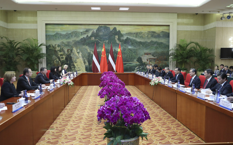 李克强首先祝贺拉脱维亚宣布独立100周年。李克强表示,拉脱维亚是中国在波罗的海地区的好朋友、好伙伴。习近平主席昨天同总统先生就推动双边关系与合作进行了深入交流。中方将一如既往尊重拉方自主选择的发展道路,愿进一步密切两国高层往来,本着市场化原则推动双边务实合作,实现互利共赢。