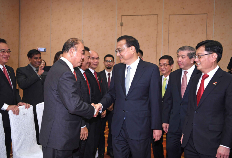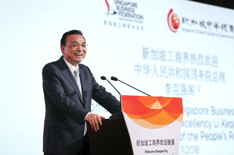 李克强说,大家回顾中新关系历史都会提到40年前,邓小平先生访问新加坡,也就在那一年,中国开启了改革开放的进程。40年来,新加坡工商界人士积极参与中国改革开放进程和现代化建设,中新获得了双赢,我对此表示诚挚的谢意和敬意。