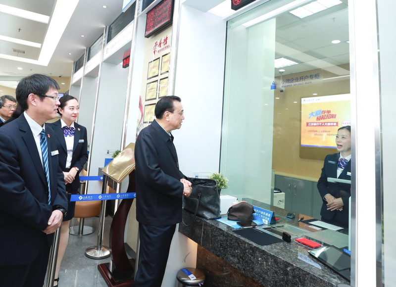 图为11月29日,李克强总理在江苏南通考察江苏银行南通崇川支行。