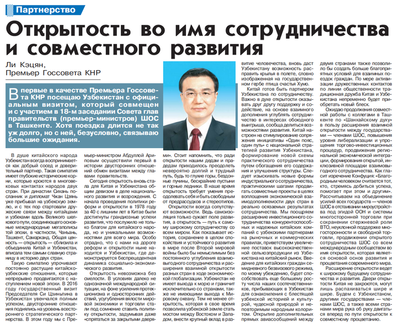 李克强总理在乌兹别克斯坦主流媒体发表署名文章