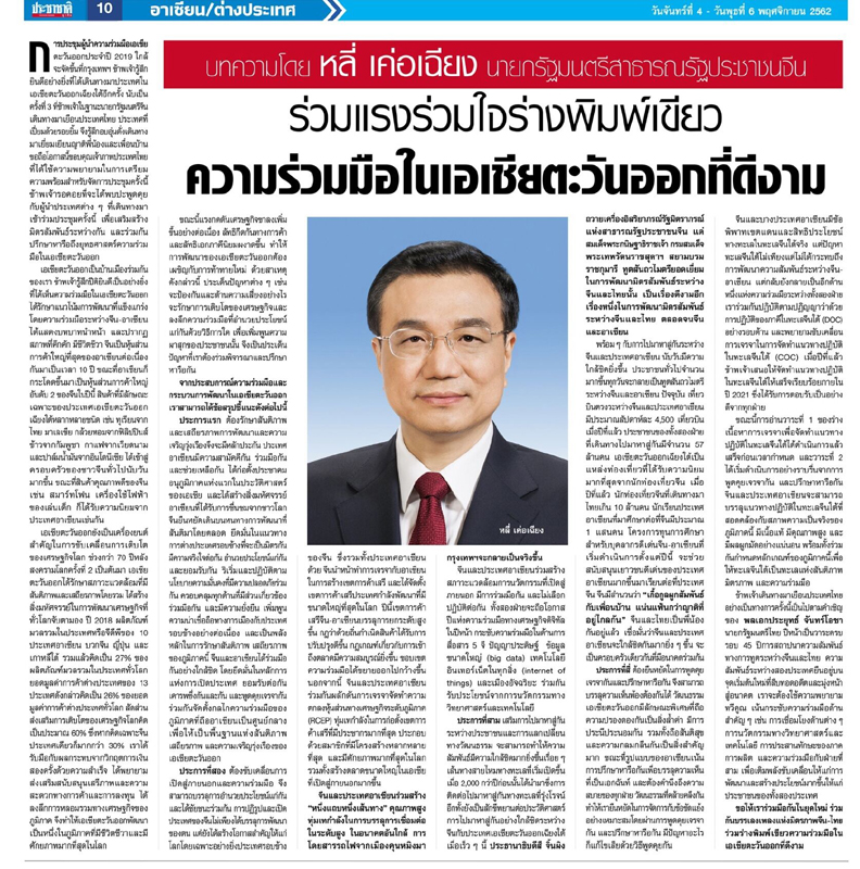 11月2日,在出席东亚合作领导人系列会议并对泰国进行正式访问前夕,江南平台入口 总理李克强在泰国《民意报》、《即时新闻》、《国家商业报》、《曼谷邮报》、《星暹日报》发表题为《携手同心,共绘东亚合作美好蓝图》的署名文章。全文如下: