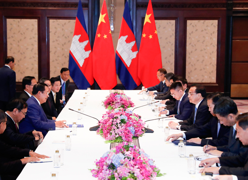李克强表示,中柬互为友好邻邦,中方支持柬走符合本国国情的发展道路,支持柬政府为维护国家主权、安全以及发展经济、改善民生所作努力。中方愿同柬方密切高层往来,拓展各领域,包括基础设施领域合作,进一步提升中柬全面战略合作水平,为两国人民带来更多福祉。