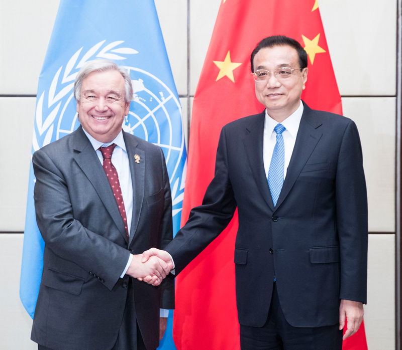李克强表示,当前国际形势错综复杂变化,中国作为联合国安理会常任理事国,将继续坚定维护多边主义,维护以联合国为核心的国际体系,维护以国际法为基础的国际秩序。中方愿深化同联合国的合作,支持秘书长先生的工作,同各方一道落实好2030年可持续发展议程。在应对气候变化问题上,中国将承担作为发展中国家应尽的国际责任和义务,遵循共同但有区别的责任原则,同国际社会一道全面有效落实《巴黎协定》,促进绿色、低碳和可持续发展。