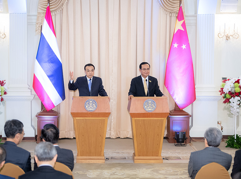 两国总理积极评价中泰合作取得的新成果。李克强表示,泰国是中国平等、互利的好朋友和好伙伴。双方互补优势强、合作潜力大。中泰两国的合作,正如曼谷湄南河上航行的长尾船,同舟共济,快速前进,行稳致远。我们愿同泰方共同努力,深化睦邻友好关系,合作应对挑战,实现互利共赢。
