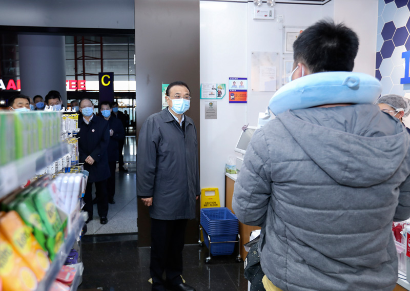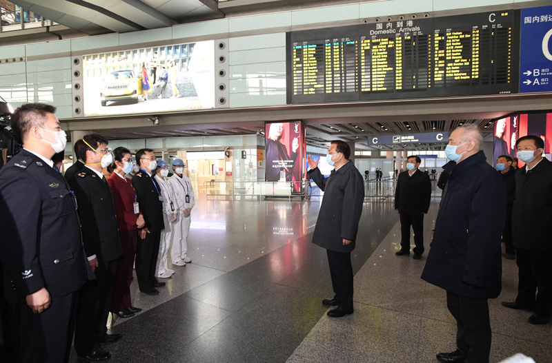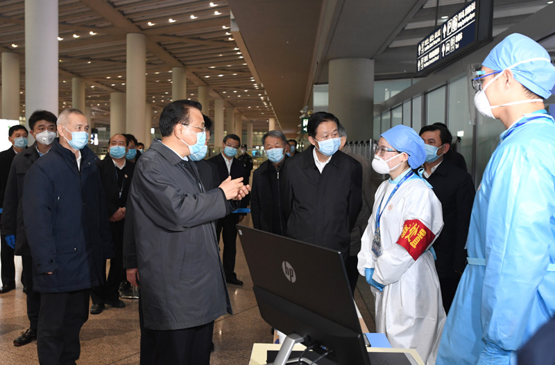 李克强走进机场商店,与一位来自东南亚国家、在北京转机的旅客交谈。他还来到航班到达出口,察看体温监测设施运行情况,并与工作人员交流,仔细询问航空运输和人员出入境采取的防控措施、出现突发情况如何快速处置,对机场采取的分区分级分类健康监测和输入风险管控措施予以肯定。李克强说,航空运输人员密集度高,你们处在防疫第一线,要把相关防控工作做到位,把好防范疫情传播的航空关口。