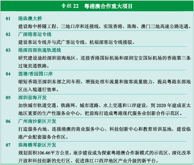 加强内地和香港、澳门交流合作,继续实施更紧密经贸关系安排。深化粤港澳合作,落实粤港、粤澳合作框架协议,促进区域经济共同发展,打造更具综合竞争力的世界级城市群。支持建设以香港金融体系为龙头、珠江三角洲城市金融资源和服务为支撑的金融合作区域,打造世界先进制造业和现代服务业基地,构建现代流通经济圈,支持广东在对港澳服务业开放中先行先试,并逐步将先行先试措施拓展到其他地区。加快共建粤港澳优质生活圈步伐。加强规划协调,完善珠江三角洲地区与港澳的交通运输体系。加强内地与港澳文化、教育等领域交流与合作。