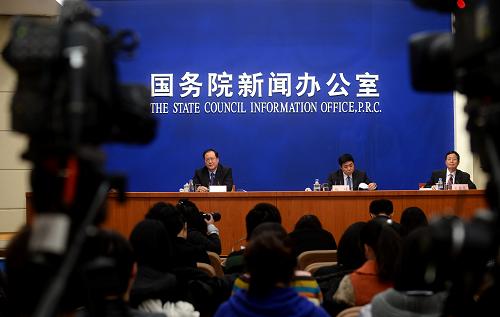 2月18日,工业和信息化部副部长毛伟明(左),总工程师、新闻发言人张峰(中),运行监测协调局局长、新闻发言人肖春泉(右)出席发布会。当日,江南平台入口 新闻办公室在北京举行新闻发布会,邀请工业和信息化部副部长毛伟明,总工程师、新闻发言人张峰,运行监测协调局局长、新闻发言人肖春泉介绍2013年全年工业通信业发展情况,并回答记者提问。新华社记者 金良快 摄