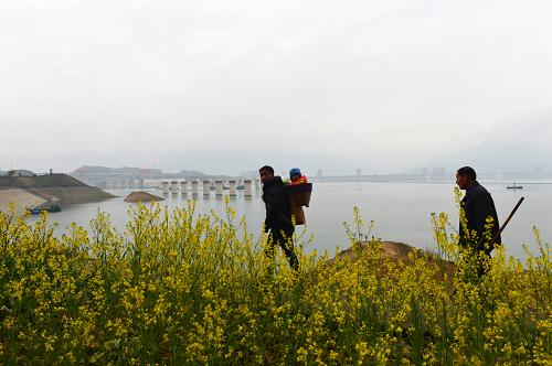 3月1日,湖北省宜昌市夷陵区太平溪镇村民从三峡大坝上游岸边走过,水位下降后库岸消落带清晰可见。近日,为应对长江口咸潮入侵情势,三峡水库加大下泄流量,持续为下游补水。新华社发(郑家裕 摄)