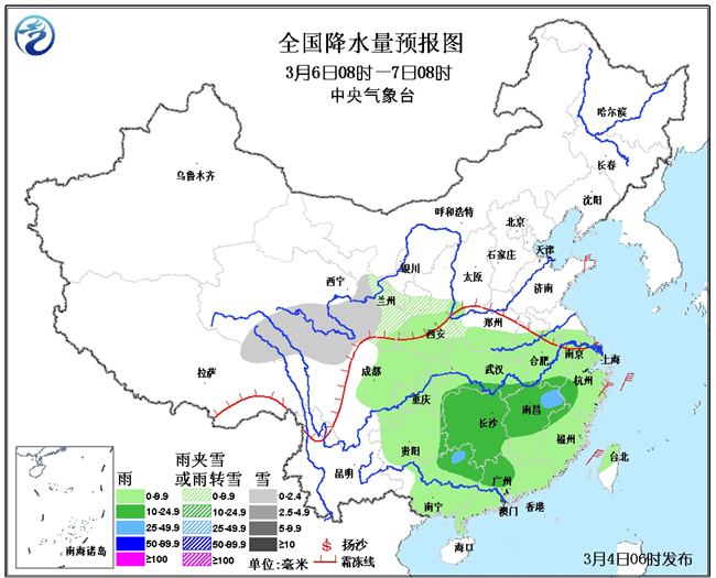 南方地区多阴雨天气 未来三天,西南地区东部、江汉、江南、华南等地多阴雨天气,江汉、江南大部、华南北部等地的部分地区有中雨,局部地区有大雨。 未来三天,冷空气继续影响中东部地区,内蒙古中东部偏南地区、华北、东北南部、黄淮、江淮、江南、华南北部等地将出现4~6℃降温,局地降温幅度可达8℃。 两会天气:3月4日7时,北京市气象台发布的《气象服务专报》显示,今天(3月4日)白天有4级左右偏北风,天安门等空旷地区风力可达5级,入夜后风力减弱至3级左右,请注意防风保暖,以防感冒。未来两天天气晴好,风力不大,但空气干燥,需及时补充水分。 未来三天具体预报: 4日08时至5日08时,西藏西南部、辽宁南部、吉林南部等地有小到中雪或雨夹雪,其中,吉林中南部局部有大雪;四川盆地西南部、贵州西部和南部、江南中东部、江淮东部、华南等地有小到中雨。内蒙古中部和东南部、华北北部等地有4-5级风。 5日08时至6日08时,西藏南部和东北部、青海南部、甘肃南部、陕西中部、山西南部等地有小雪或雨夹雪;云南西北部、陕西南部、黄淮西部、江汉大部、江淮西部、西南地区东部、江南大部、华南大部、台湾等地有小到中雨。台湾海峡有6~8级、阵风9级的东北风。 6日08时至7日08时,青海东南部、甘肃中南部、川西高原北部等地有小雪或雨夹雪;陕西西南部、黄淮西南部、江汉、江淮大部、西南地区东部、江南大部、华南大部、台湾北部等地有小到中雨,其中江西东北部、广西北部的部分地区有大雨。东海南部、台湾海峡有6~8级、阵风9级的东北风。 |