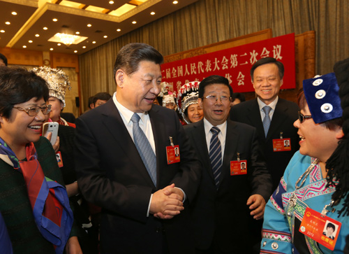 3月7日,中共中央总书记、国家主席、中央军委主席习近平参加十二届全国人大二次会议贵州代表团的审议。 新华社记者鞠鹏摄 |