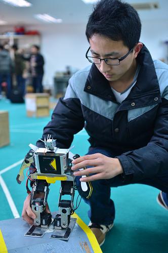 3月11日,南通大学机器人创新设计团队学生在展示设计的人形机器人。当日,江苏南通大学机器人创新设计团队在学校实验室进行机器人创新设计成果展示,展出最近一次中国机器人大赛暨RoboCup公开赛上的获奖作品。新华社记者 沈鹏 摄