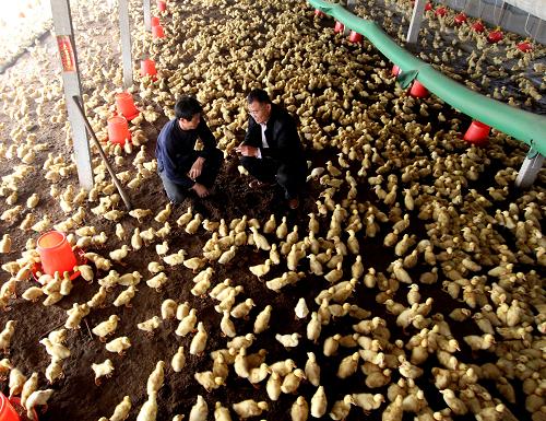 3月11日,在山东省沂南县双堠镇张铁峪村苏庆福的鸭棚内,畜牧技术人员李健(右)指导养殖户环保垫料的使用技术。新华社发(杜昱葆 摄)