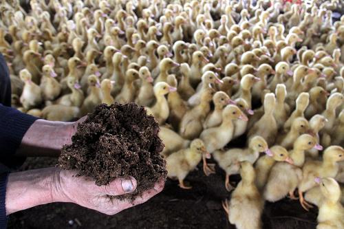 3月11日,山东省沂南县双堠镇张铁峪村苏庆福和家人在鸭棚内翻环保垫料。山东省沂南县是肉鸭养殖大县,肉鸭每年出栏3.2亿只。传统养鸭多是利用水冲鸭粪,易导致水源污染及疫情难控等问题。自2009年起,当地畜牧部门成功探索出“环保垫料养鸭技术”。养鸭户在棚内铺设锯末、秸秆与发酵菌混合的生物发酵垫料,使鸭的排泄物在有益菌的作用下及时发酵分解。使用后的垫料可作为有机肥料用来种植蔬菜;养鸭场的粪污也通过这种方式实现了免冲洗、零排放,提高了产品质量安全水平。目前,沂南县通过政府补贴推广环保养鸭面积100万平方米。新华社发(杜昱葆 摄)