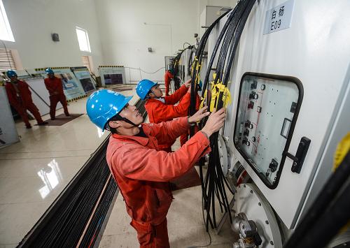 3月12日,在湖州110千伏大云变电所内,湖州供电公司电力工人正在对变电所进行扩建,确保工程如期投运。新华社记者 徐昱 摄