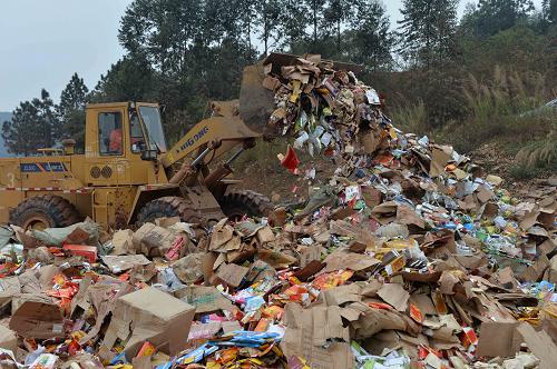 3月14日,在广西南宁市城南垃圾填埋场,一台装载机在销毁假冒伪劣食品药品。当日,广西南宁市工商及食品药品监管部门在城南垃圾填埋场集中销毁一批假冒伪劣商品,其中南宁市工商局集中销毁各类假冒伪劣商品2.5万件。新华社记者 周华 摄