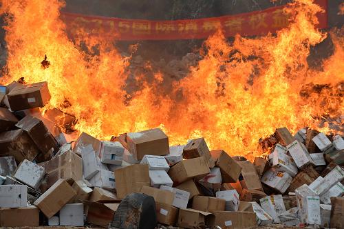 3月14日,在广西南宁市城南垃圾填埋场,工商部门在焚毁假冒伪劣商品。新华社记者 周华 摄