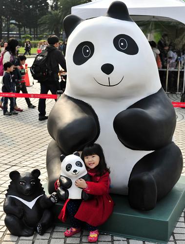 3月14日,台北“两厅院”艺文广场,纸雕大熊猫与台湾黑熊和观众见面。新华社发(吴景腾 摄)